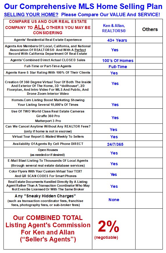 YOU CAN TRUST US TO SELL (OR BUY) YOUR HOME: Prior to becoming a REALTOR®, Kenneth Wozny was a successful Doctor Of Optometry for 25 years with multiple offices in southern California. He has 23+ years of extensive experience so far as a REALTOR®. Collectively, he has worked directly with the public for 45+ years and in these 45+ years he NEVER has received ANY public complaints or any issues with the California Board Of Optometry or the California Department Of Real Estate. Allan Gesmundo, REALTOR® has been licensed in California for over 10 years plus 10 years prior in Pennsylvania.