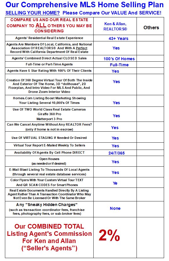 YOU CAN TRUST US TO SELL (OR BUY) YOUR HOME: Prior to becoming a REALTOR®, Kenneth Wozny was a successful Doctor Of Optometry for 25 years with multiple offices in southern California. He has 23+ years of extensive experience so far as a REALTOR®. Collectively, he has worked directly with the public for 45+ years and in these 45+ years he NEVER has received ANY public complaints or any issues with the California Board Of Optometry or the California Department Of Real Estate. Allan Gesmundo, REALTOR® has been licensed in California for over 10 years plus 10 years prior in Pennsylvania.